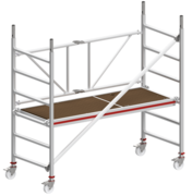 In der kleinsten Ausführung ist das Klappgerüst in der Reichhöhe von 2,80 m verfügbar. Als Fahrgerüst ist es mit vier, in alle Richtungen drehbare Lenkrollen ausgestattet. Dadurch kann es mühelos in Längs- und Querrichtung verschoben werden, ohne dass es umzukippen droht. Optional gibt es die Rollen auch als höhenverstellbare Spindelversion, sodass das Gerüst ebenso an Treppen, Absätzen oder auf unebenen Böden im Innenraum sicher betreten werden kann.