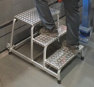 BU: Oft kommen schwere Modelle aus Stahl zum Einsatz. Da braucht es dann zwei Leute, um so einen Tritt an einer anderen Maschine zu platzieren. Das Leichtgewicht von HYMER ist deutlich flexibler und zudem optional mit Rollen versehbar.