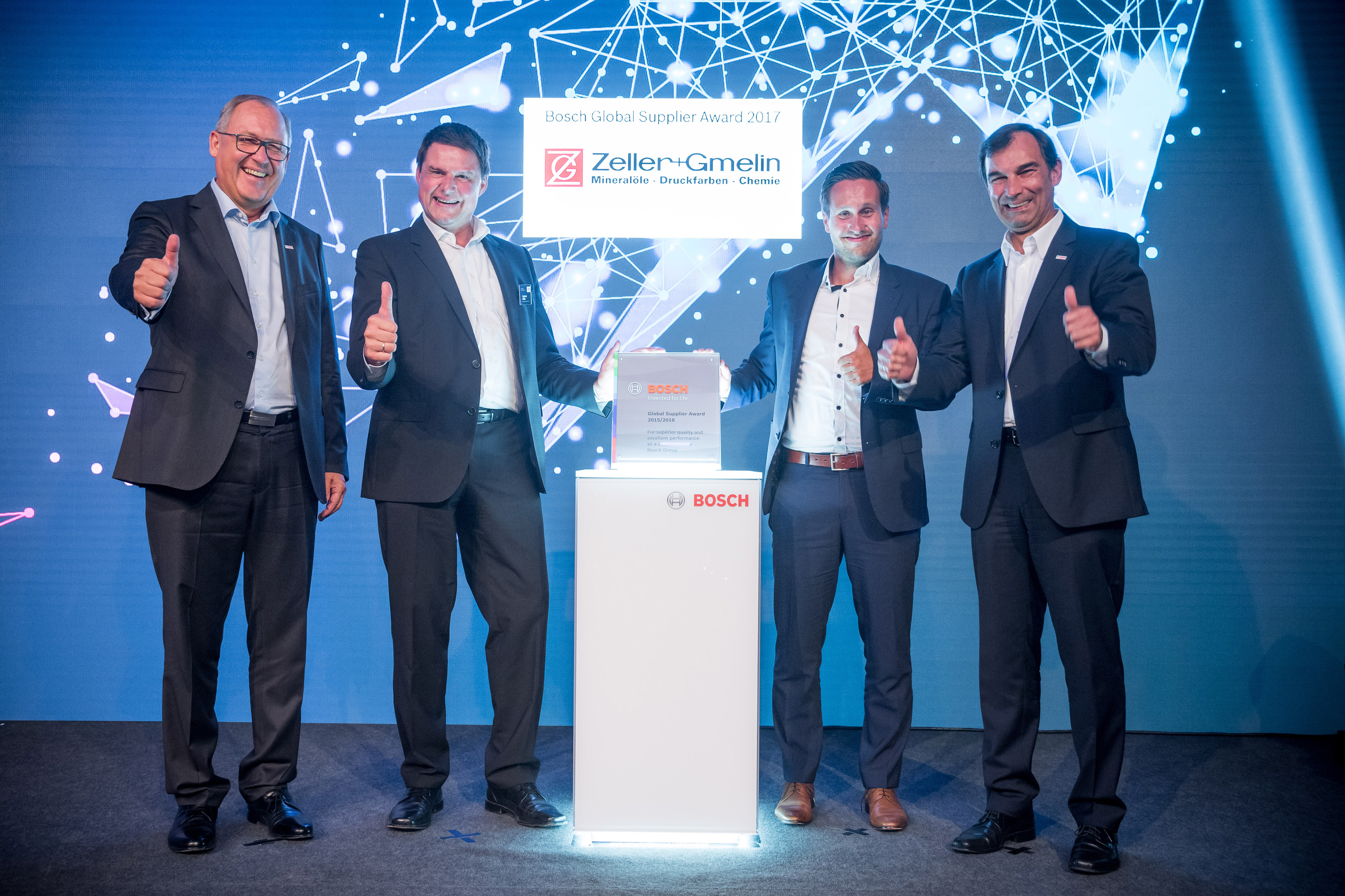 EISLINGEN, 28. Juli 2017 – Wer mit dem Bosch Global Supplier Award ausgezeichnet wird, der gehört zu den Besten seiner Sparte: Schmierstoffexperte Zeller+Gmelin erhielt die Auszeichnung in diesem Jahr zum sechsten Male in der Kategorie „Indirekter Einkauf“ und steht damit in einer Reihe namhafter Industriezulieferer wie Balluff, Chiron oder der Hoffmann Gruppe. Seit vielen Jahren setzt Bosch in den weltweiten Fertigungswerken erfolgreich hochwertige und teilweise speziell für Bosch entwickelte Schmierstoffe von Zeller+Gmelin ein. Zeller+Gmelin ist es zusätzlich gelungen sich als Lieferant von unterschiedlichen Kalibrierflüssigkeiten u. a für die Endabprüfung der Diesel-Einspritzausrüstung zu etablieren.