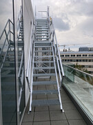 BU: Übergang zum Dach auf stabiler Betonplatte befestigt: Die obere Plattform führt über die Dachkante hinweg und ragt ca. 100 cm aufs Dach. So bietet sie den Servicetechnikern einen sicheren Übergang zu der WDR-Heiztechnik.