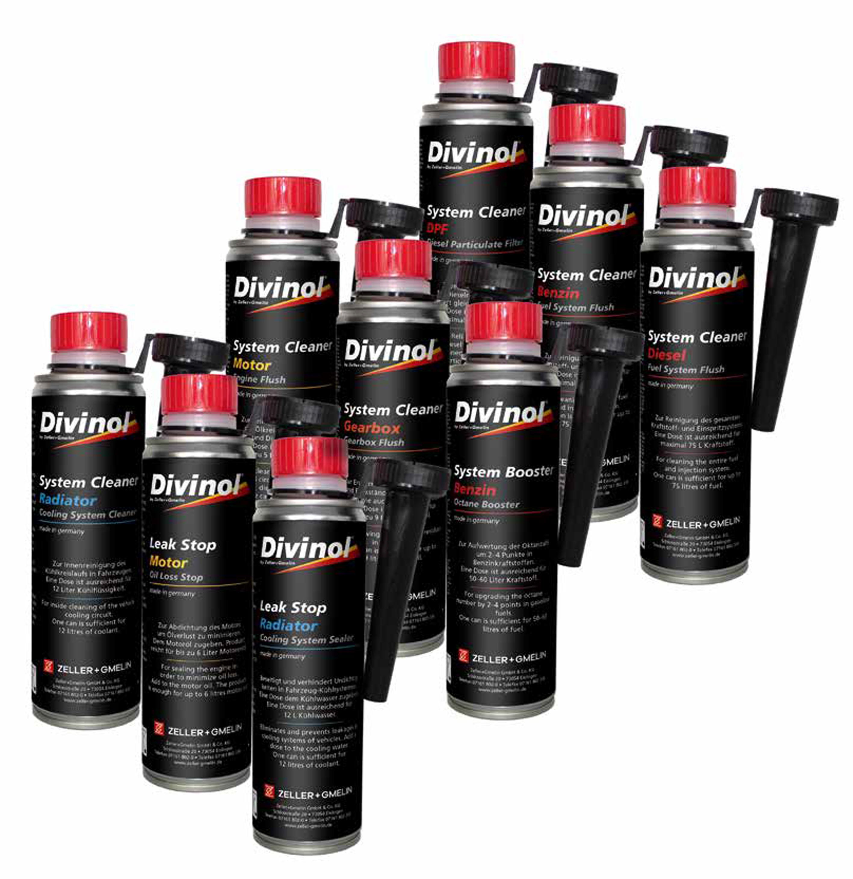 Mit dem „Divinol System Booster Benzin“ kommt ein Oktanbooster für Kraftstoffe mit niedriger Oktanzahl oder Motoren mit erhöhtem Oktanzahlbedarf. Eine Dose (250 ml) reicht für ca. 50–60 Liter Kraftstoff. Der Kraftstoffsystemreiniger „Divinol System Cleaner Benzin“ löst verhärtete Ablagerungen und sorgt für eine bessere Bauteilpflege. Auch dieser Cleaner verbessert die Laufkultur und reduziert den Benzinverbrauch. Der „Divinol System Cleaner Diesel“ reinigt das gesamte Kraftstoffsystem ohne Werkstattbesuch, optimiert den Startvorgang und reduziert die Rauchentwicklung. Zur Reinigung des Abgasstrangs und Partikelfilters ist „Divinol System Cleaner DPF“ verfügbar. Es sorgt für einen sauberen Motorlauf und optimierte Emissionswerte.