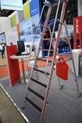BU: Die Newcomerin in der R13-Generation: Die Plattformleiter 8681 mit Kipprollen und langem Handlauf war 2023 auf der Logimat in Stuttgart zu sehen. Sie eignet sich besonders für längere Arbeiten in feucht-rutschigen Arbeitsumgebungen. Sowohl die Trittflächen als auch die Plattform oben ist komplett beschichtet.