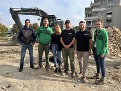 BU: Gemeinsam am Aushub (v.l.n.r.): Markus Deil, Schmierstoff-Händler von Zeller+Gmelin zusammen mit Johannes Friedrich, Geschäftsführer + Gründer der Friedrich Umwelt GmbH. Außerdem vor Ort: Anja Fleischer (Marketingmanagement, Zeller+Gmelin), Jonas Friedrich (Baggerfahrer, Friedrich Umwelt GmbH), Markus Prieto (Business Unit Sales Manager Forestry + Biograde, Zeller+Gmelin), Leonie Linder (Assistentin der Geschäftsleitung, Friedrich Umwelt GmbH).