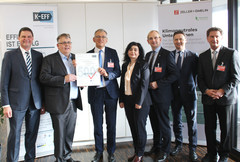 500. KEFF-Check bei Zeller+Gmelin (v.l.): Geschäftsführer Siegfried Müller und Thomas Alpers, Ministerialdirektor Helmfried Meinel, Leiterin Qualität- und Umweltmanagement Gülen Ak, Gernot Imgart (IHK Bezirkskammer Göppingen), Geschäftsführer Walter Jerusalem, Klaus Heininger (OB der Stadt Eislingen).